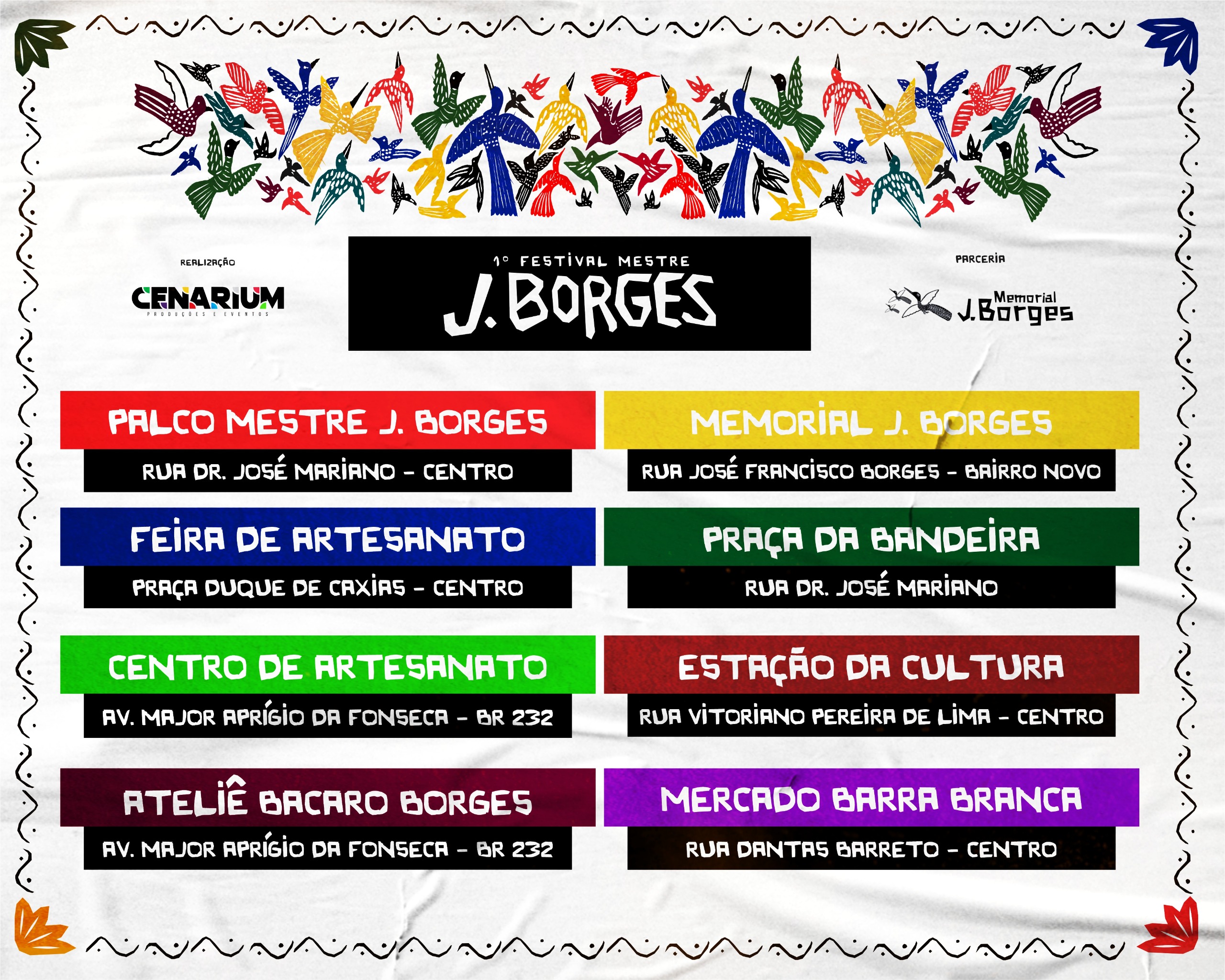 Entre os dias 18 a 21 de dezembro deste ano, Bezerros recebe a 1ª edição do Festival Mestre J. Borges, que tem como objetivo homenagear o artista bezerrense e também promover a difusão cultural do seu legado artístico e cultural. Por meio de sua arte, J. Borges levou o nome do município para os quatro cantos do país e do mundo. A programação do evento contempla quatro dias, sendo um deles a data que marca o nascimento do artista, dia 20 de dezembro. De acordo com a Organização do Festival serão oito polos espalhados pelo município, com uma programação recheada de shows artísticos (artistas locais e regionais), exposições, oficinas culturais, feira de artesanato, concursos de LER NOTÍCIA