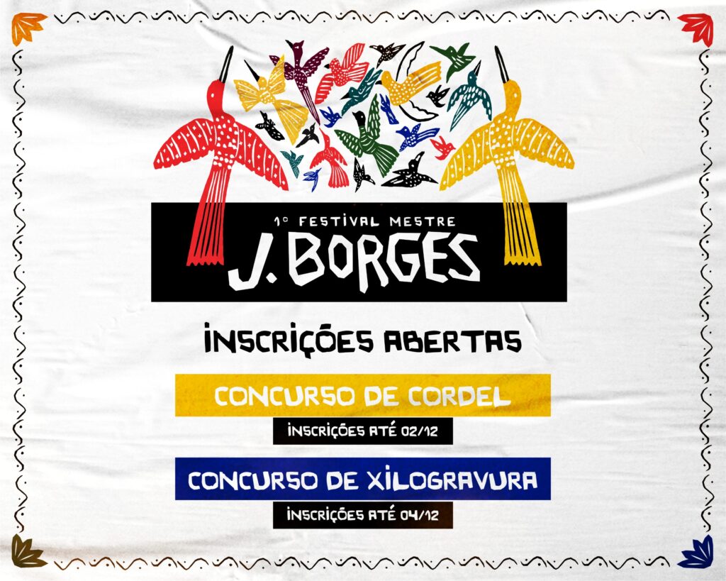 Estudantes da rede municipal de ensino de Bezerros e amantes da xilogravura podem participar de forma criativa e inovadora do 1º Festival Mestre J. Borges, que será realizado entre os dias 18 a 21 de dezembro de 2025. A organização do evento lançou editais para o Concurso de Cordel e Concurso de Xilogravura, ambos com temática central sobre a história do saudoso mestre xilogravurista e cordelista J. Borges. Cada edital, disponível na bio do Instagram do Festival (@festivaljborges), contém os critérios e categorias de participação.